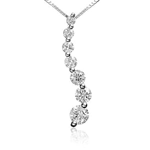 This elegant multi-stone diamond pendant is designed to represent the notion that love is a journey shaped by time and experience. Seven individual prong-set diamonds, with a total weight of 1/4 carat, are graduated in size and arranged along an S-shaped bar of 14 carat white gold. Much as a three-stone diamond symbolizes your past, present, and future as a couple, a journey diamond represents the continual growth of your life and love together. This beautifully-designed pendant makes a meaningful gift for an anniversary or other special occasion. It is showcased on a delicate and brightly polished white gold box chain that measures 18 inches and fastens with Women's Interest.